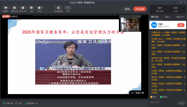为引导我校学生关爱身心,健康发展,缓解疫情期间的情绪困扰,在第十六届心理健康教育月期间,学生工作部(处)心理健康教育服务中心于4月20日开展心灵讲堂第二讲,特邀我校兼职心理咨询师、国家二级心理咨询师、系统式家庭治疗师刘峰为我校学生作“静心探寻 静待花开——正念压力管理”专题讲座。学生工作部(处)副处长、心理学院副院长刘毅主持讲座。4200余名本专科生、研究生、教职工通过线上线下参与讲座,覆盖20个学院。