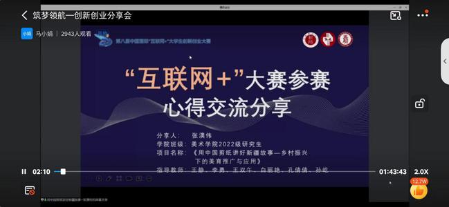 本次分享会特邀本年度在各类创新创业大赛中取得优异成绩的美术学院22级绘画专业研究生张澳伟、20级美术学专业研究生袁娟,教育科学学院特殊教育19-9班李雨彤、王永洁,体育学院 21级体育人文社会学专业研究生李越,马克思主义学院21级马克思主义中国化专业研究生陈韦宏等6位项目负责人进行经验分享。他们结合各自参赛的实际情况和具体收获就参赛项目选题、项目书和路演讲稿撰写、路演视频制作、参赛项目定位、项目质量提升、项目团队培养等内容为参会学生做了全面而细致的讲解。