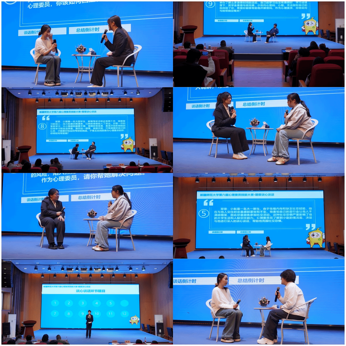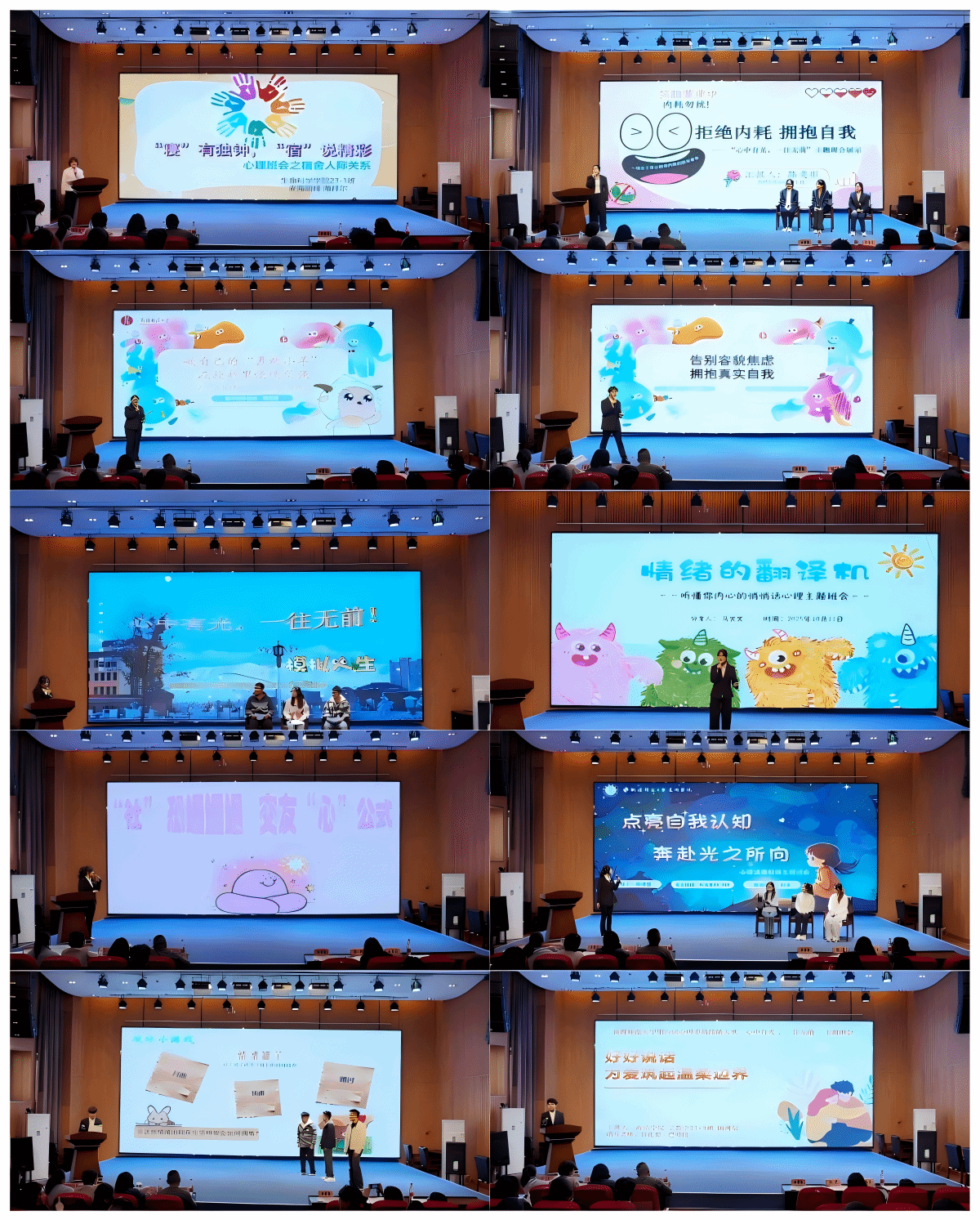 本次决赛,设置“主题班会风采展示”和“朋辈谈心谈话情境模拟”两个环节。在主题班会展示中,选手们围绕宿舍关系、自我内耗、容貌焦虑、社交恐惧、情绪管理等大学生普遍关注的心理议题,设计了内容丰富、形式多样的心理健康主题班会。在谈心谈话情境模拟中,面对助演同学生动演绎的心理困扰场景,选手们沉着冷静、灵活运用朋辈辅导技巧,准确把握问题关键,展现了良好的专业素养与应变能力,现场气氛热烈,掌声不断。
