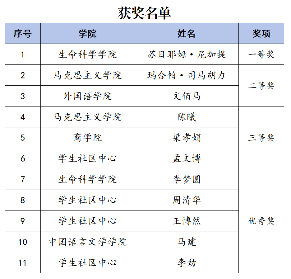 本次比赛特邀我校政法学院党委书记唐文睿、教务处副处长姜玉琴、马克思主义学院副院长罗志佳、新疆医科大学党委学生工作部思想政治工作科科长邓丽萍、新疆农业大学学生处思想政治工作科科长牛超担任评委,我校党委学生工作部部长张进、副部长姜云琴、各学院辅导员代表及学生代表参加。