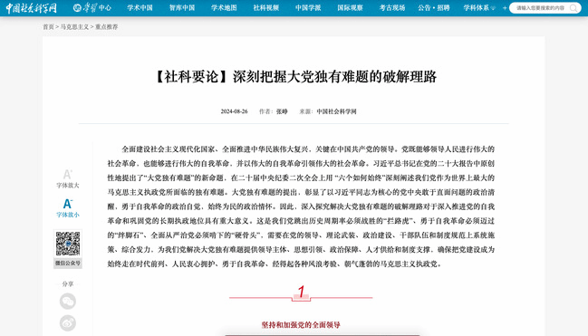 全面建设社会主义现代化国家、全面推进中华民族伟大复兴,关键在中国共产党的领导。党既能够领导人民进行伟大的社会革命,也能够进行伟大的自我革命,并以伟大的自我革命引领伟大的社会革命。习近平总书记在党的二十大报告中原创性地提出了“大党独有难题”的新命题,在二十届中央纪委二次全会上用 “六个如何始终”深刻阐述我们党作为世界上最大的马克思主义执政党所面临的独有难题。大党独有难题的提出,彰显了以习近平同志为核心的党中央敢于直面问题的政治清醒,勇于自我革命的政治自觉,始终为民的政治情怀。因此,深入探究解决大党独有难题的破解理路对于深入推进党的自我革命和巩固党的长期执政地位具有重大意义。这是我们党跳出历史周期率必须战胜的“拦路虎”、勇于自我革命必须迈过的“绊脚石”、全面从严治党必须啃下的“硬骨头”,需要在党的领导、理论武装、政治建设、干部队伍和制度规范上系统施策、综合发力,为我们党解决大党独有难题提供领导主体、思想引领、政治保障、人才供给和制度支撑,确保把党建设成为始终走在时代前列、人民衷心拥护、勇于自我革命、经得起各种风浪考验、朝气蓬勃的马克思主义执政党。