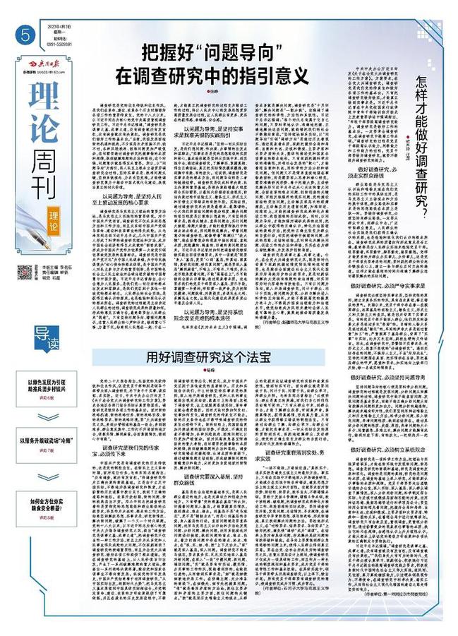 调查研究是党的优良传统和优良作风,是我们在革命、建设、改革各个历史时期做好各项工作的重要传家宝。党的十八大以来,以习近平同志为核心的党中央高度重视调查研究工作。习近平总书记强调,“调查研究是谋事之基、成事之道,没有调查就没有发言权,没有调查就没有决策权。调查研究是我们做好工作的基本功。”当前,我国发展面临新的机遇和挑战,不少深层次矛盾躲不开、绕不过,各种风险挑战、困难问题更加严峻复杂,迫切需要通过调查研究把握事物的本质和规律,找到破解难题的办法和路径,这个时候,问题意识就显得至关重要。所以,以“问题导向”为指引,将人民至上根本立场贯穿调查研究全过程,坚持实事求是、找准问题关键,坚持系统观念、力求攻坚克难,才能使调查研究聚力于推动中国式现代化建设,展现出真正的时代价值。