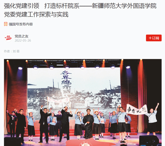 新疆师范大学外国语学院党委紧扣立德树人根本任务,创新党建工作模式,确立“党建与教学科研、党建与实践教育、党建与文化建设深度融合”建设路径,以高质量党建引领学院事业高质量发展。2021年,外国语学院党委获评“新疆高校党建工作标杆院系”,学院教师第二党支部获评“新疆高校党建工作样板支部”。