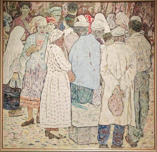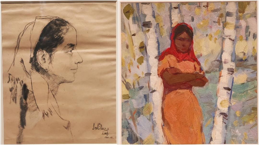 作为“文化十字路口”,新疆美术的独特性在跨地域创作中尤为显著。展览通过闻立鹏、孙景波等非本土艺术家的视角,揭示了跨地域创作如何催化文化认同的生成路径。例如,闻立鹏1961年的《新疆妇女侧面像》以炭笔线条提炼女性的面部特征,油画《白桦前的少女》以高饱和色彩重构边疆意象。这种创作并非对地域风情的猎奇,而是基于中华文化共性的在地化转译——艺术家以个人视角介入新疆风土,最终形成“多元一体”的美学表达。
