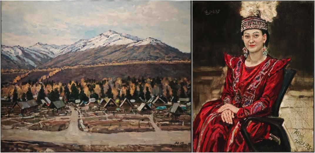 孙景波《阿勒泰的演员》则用写实手法真实地反映画家眼中演员形象,重点刻画人物独特的样貌和服饰特征。风景作品《阿勒泰十月初雪的禾木村》展现了阿勒泰秋末冬初的自然场景,禾木独特的尖顶木屋与禾木的自然环境交相呼应,表达出宁静和谐的氛围。前者画家用跨地域视角观察新疆特色,将新疆地域特色放大,用全新的视角看待新疆美术创作方向。后者则更多展现基于中华文化共性的乡土认同,本真纯洁的自然景观,人与自然和谐共生。