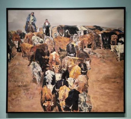 画家秦天星的作品《响动的大地之新疆山像》使用综合材料混合油画颜料,在画布上制造出龟裂的山石肌理。画家关注自然,对山体造型情有独钟,通过极具张力的构图和色彩,将自然景观升华为充满诗意的精神符号。青年画家刘贯冲的《向未来·可可托海之约3》采用新颖的绘画手法和高度概括的色彩,将冰雪运动项目与可可托海的雪域风景有机结合。画家以淡雅的浅白色表现可可托海优质的雪地资源,身穿滑雪服的青年男女为这冰天雪地增添了青春的气息与活力。在画家高江的作品《阵》中,牧民的生存智慧与自然的和谐共生关系,通过油画媒介的物性特质获得了史诗性表达。作品突破风景画的人类中心主义视角,建构起游牧生态视觉人类学的观察范式。在画家宋环的《童年记忆——父亲的棉袄》、画家冯瑜的《幸福时代——印记》、画家王铁的《高原·阳光》等油画作品中,同样可以看到人们幸福生活的温馨。画家们笔下的人物形象神态丰富,或回忆往昔,或乐于当下,或憧憬未来。画布上每一道笔触,都是海德格尔“诗意栖居”的当代注释——这或许正是边疆油画在铸牢中华民族共同体意识语境中独特的在地性价值。