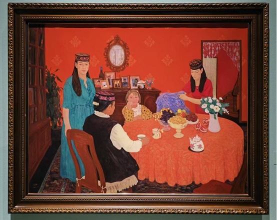 多年以来新疆的画家们始终坚持以人民为中心的创作导向,通过聚焦新疆各民族间交往交流的日常生活,将艺术的理想与人民生活紧密结合,写实的画面真实地表达着新疆社会稳定、人民安居乐业的良好氛围。如李勇的《高原朋友圈》、波里亚的《杏熟季节》、邓乐平的《大美兵团盛世丰年》、解彬的《晒幸福》、谢勇琪的《丝路——绿色家园》等,以各自的视角描绘了一幅幅生动火热的生活场景,也是新时代以来新疆从脱贫攻坚到乡村振兴,实现跨越式发展的缩影。写实的人物形象与概括的图形化背景相结合,艺术的升华让新疆各族人民的幸福感跃然可见。