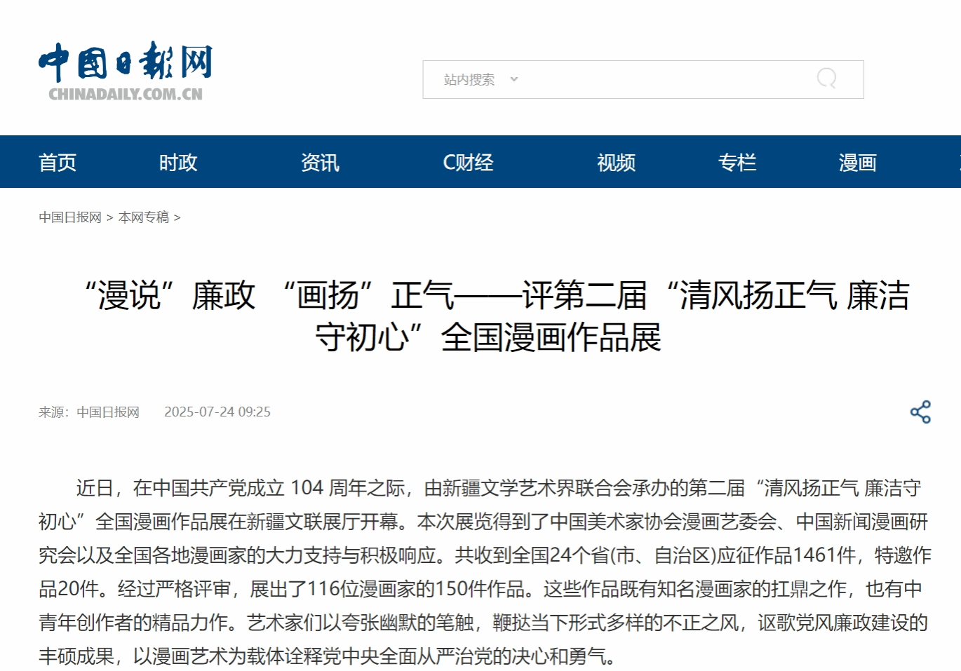 “清风扬正气,廉洁守初心”全国漫画作品展的成功举办,是以漫画艺术持续深入推进新时代廉洁文化建设的有效路径,这150幅漫画作品,如150面镜子,照见问题,也照见希望;如150盏明灯,照亮黑暗,更照亮光明。当漫画成为廉洁教育的“轻骑兵”,当幽默成为反腐倡廉的“软实力”,求真务实、清正廉洁的新风正气也必将在每个观众心中得到涵养和净化。(作者:唐莉霞 新疆评协造型艺术专委会秘书长、新疆师范大学美术学院副教授;吴籽萱 新疆师范大学美术学院;中国日报记者毛卫华|唐莉霞 吴籽萱)