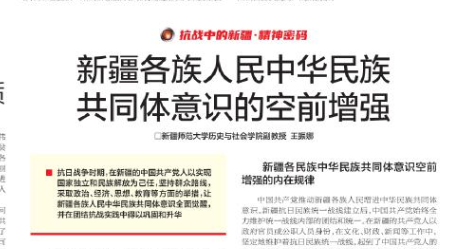 抗日战争时期,在新疆的中国共产党人以实现国家独立和民族解放为己任,坚持群众路线,采取政治、经济、思想、教育等方面的举措,让新疆各族人民中华民族共同体意识全面觉醒,并在团结抗战实践中得以巩固和升华。