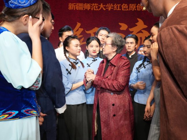 演出结束后,剧中人物、曾在师范学校任教的共产党人文斐然、许亮、刘子平的亲属王星汉、许健康、马苏苏,曾任省立一中校长、巴楚县县长的共产党员李云扬之子李胜利以及我校建校第一任校长高琳之女高峡受邀上台,由学生代表献花并向他们致敬。刘子平的外甥女马苏苏在讲话时潸然泪下,感谢师生没有忘记自己的父辈,回溯了自己孩童时期在新疆的狱中记忆和抗争故事,深情讲述令在场观众热泪盈眶。