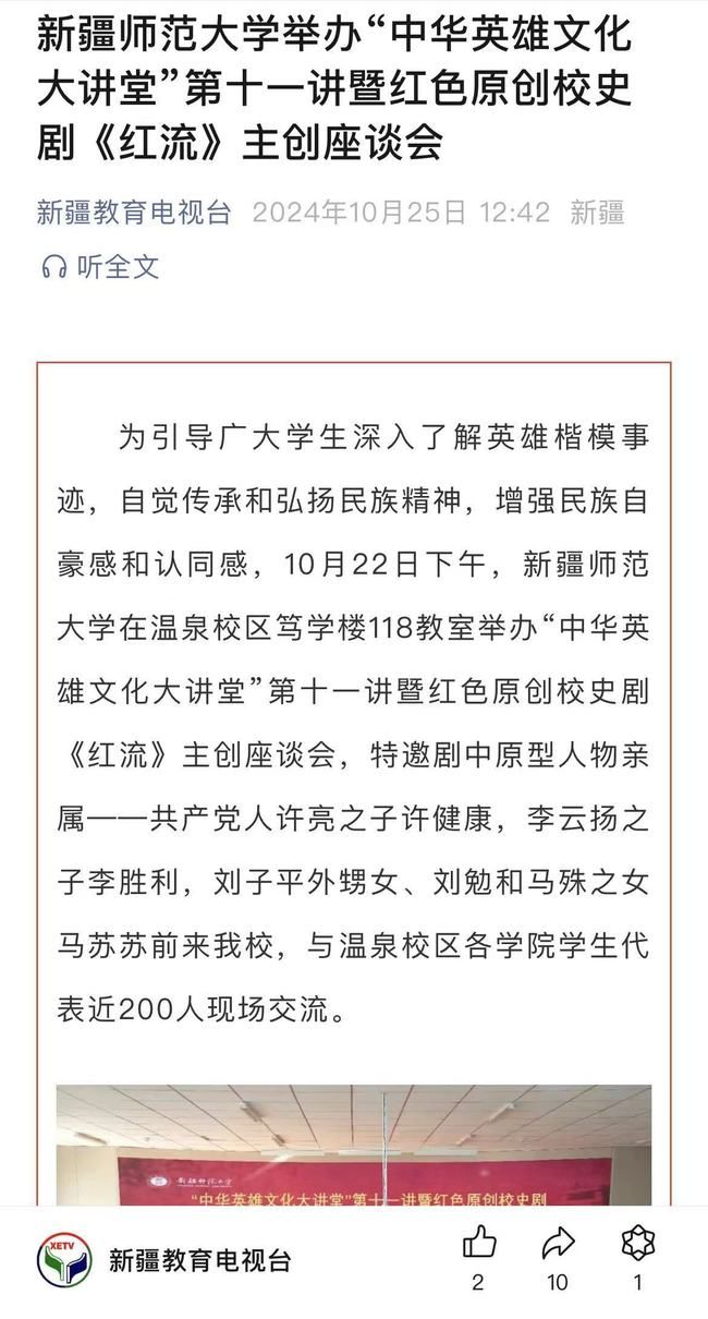 新疆教育电视台 | 新疆师范大学举办“中华英雄文化大讲堂”第十一讲暨红色原创校史剧《红流》主创座谈会