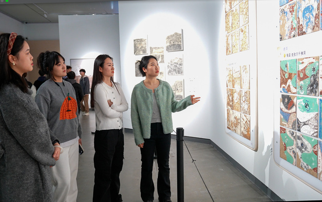 实践活动以美术专业与其他各专业学生交叉组队的形式开展,由美术专业研究生带队,从专业角度为其他专业学生介绍龟兹石窟壁画的题材和内容。通过细致认真的讲解,观展学生积极开展互动交流,大家在古今交映中感受文明对话,在传统与当代之间找到新的链接点。观展学生纷纷表示,此次展览既具有穿越千年的艺术氛围,又呈现出龟兹壁画前世今生的发展脉络,帮助大家获得了超越时空的文化体验和艺术感受,使一次美的探索之旅。
