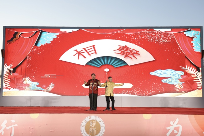 演出现场,自治区曲艺家协会主席、国家一级演员、天山笑声俱乐部主席高建新,中国曲艺家协会会员、兵团曲艺家协会副主席荣卫,自治区曲艺家协会理事、天山笑声俱乐部秘书长王洋,乌鲁木齐市艺术剧院青年舞蹈家木巴拉克· 斯坎旦尔,新疆本土著名相声演员王欢乐、朱国平为现场师生带来了精彩的相声和歌舞表演,现场掌声不断,好评如潮。高靖代表学校党委向自治区曲艺家协会和天山笑声俱乐部赠送锦旗,感谢两家单位在我校传承中华优秀传统曲艺文化,推动新时代曲艺文化进校园工作中所做出的贡献。