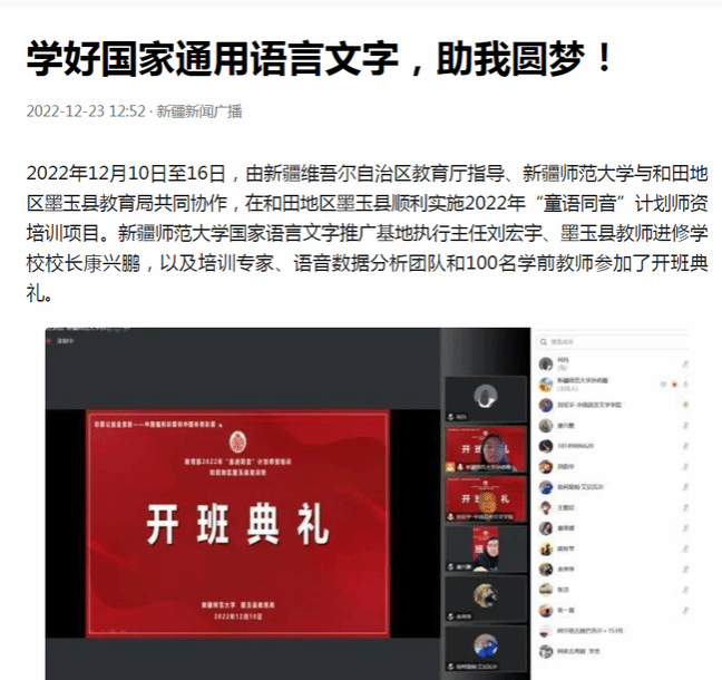 2022年12月10日至16日,由新疆维吾尔自治区教育厅指导、新疆师范大学与和田地区墨玉县教育局共同协作,在和田地区墨玉县顺利实施2022年“童语同音”计划师资培训项目。新疆师范大学国家语言文字推广基地执行主任刘宏宇、墨玉县教师进修学校校长康兴鹏,以及培训专家、语音数据分析团队和100名学前教师参加了开班典礼。
