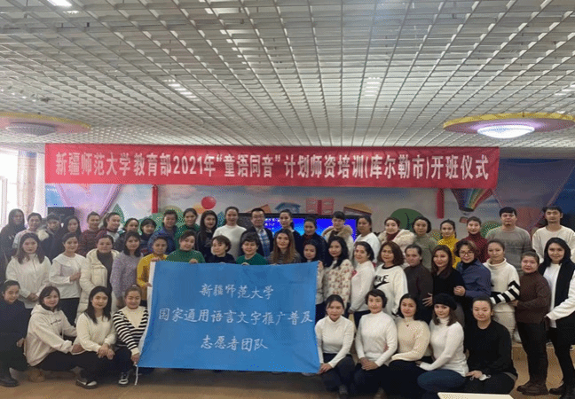 国家语言文字基地顺利实施教育部“童语同音”计划师资培训。2021年12月起,基地组织了一支由语言文字、语言教学、语言科技、学前教育专家组成的教学团队,赴伊犁州伊宁县、塔城地区托里县、巴州库尔勒市、焉耆回族自治县、吐鲁番市高昌区、哈密市伊州区6地为600名幼儿园教师进行国家通用语言培训,得到受训单位和学员的高度肯定,相关通讯5次被教育部“推普助力乡村振兴”官方微信公众号转载。培训效果良好,社会反响热烈。