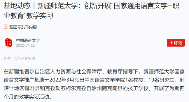 国家语言文字推广工作扎实开展的同时产出了系列成果简讯,如《新疆师范大学:开展国家通用语言文字推广普及系列调研》《新疆师范大学:创新开展“国家通用语言文字+职业教育”教学实习》《新疆师范大学:组织开展第一届经典诵写讲大赛 》等,实时在“学习强国”平台刊载,其成果与经验供全国其他基地借鉴学习。