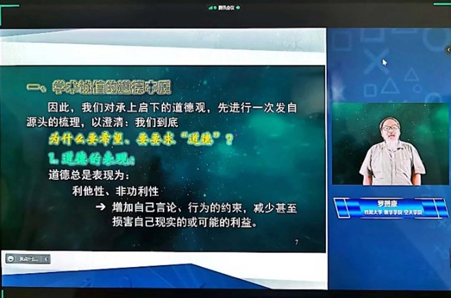 首先,同学们观看了四川大学数学学院罗懋康教授为大家录制讲授的主题讲座——“从道德本质到学术诚信”。罗老师强调,道德是一种社会意识,是一种特殊的调节规范体系及实践精神,而学术诚信是学术发展和社会进步的基石。诚信不仅是个人需要具备的基本品质,更是科研工作的基本要求。学术诚信体现着一个人的道德,只有在学术中保持诚信,才能在科研道路上走得更好、更远。演讲的最后,罗老师以将“为师者六大维度”与“为学者十二超越”十二字箴言赠与同学们,勉励大家在接下来的学习与研究中恪守学术诚信,追求高水平与高境界。