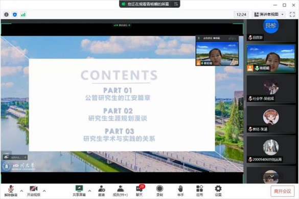 接着,学院团委书记、2022级研究生辅导员青杨媚老师就研究生生涯规划与同学们进行了交流。青老师依次从公管研究生的江安篇章、研究生生涯规划漫谈、研究生学术与实践的关系三方面,简单介绍了江安校区的生活环境,分享了研究生期间的重要时间节点把握、如何平衡学术与实践的关系的个人经验建议,并鼓励大家精准时间管理,提前做好生涯规划,珍惜宝贵的学习时间,努力书写一段精彩的研究生生涯。
