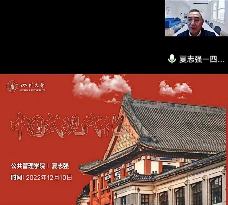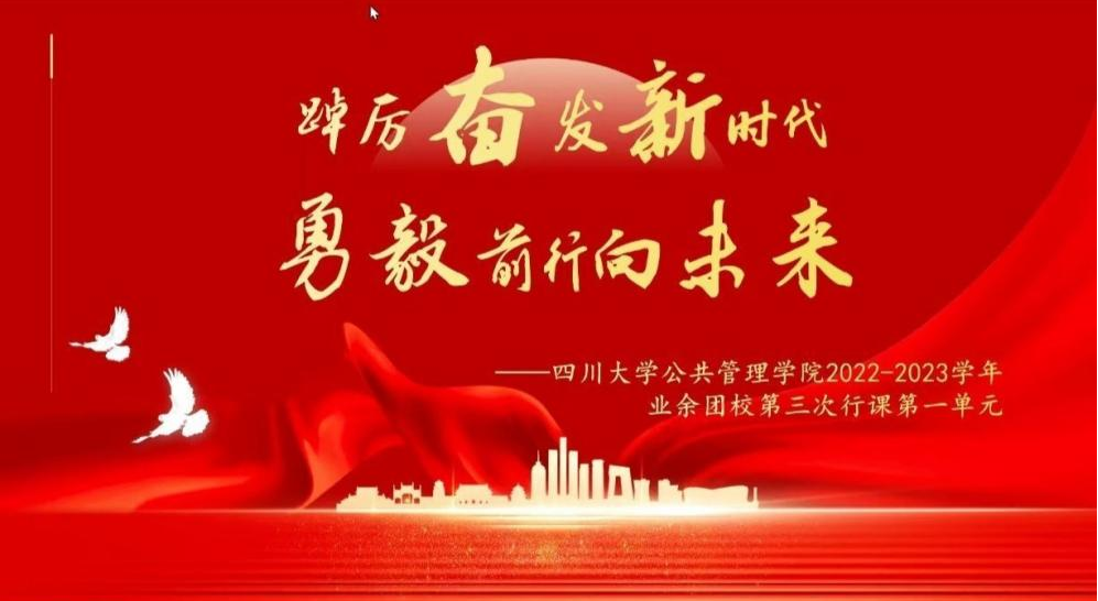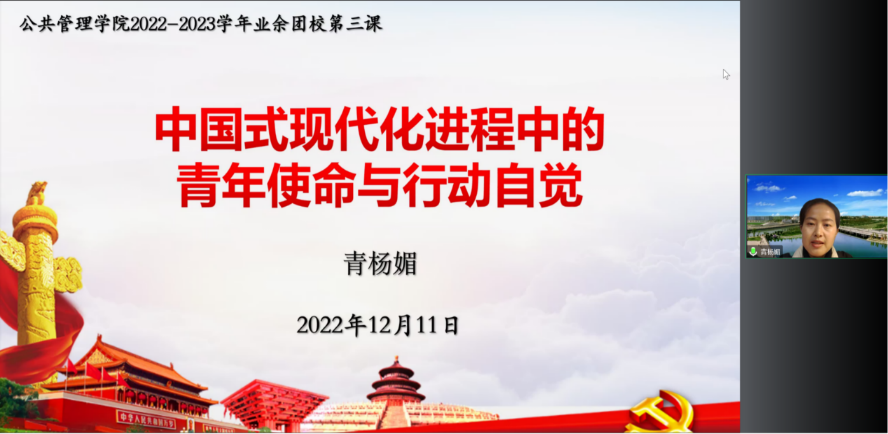 为学习二十大精神,深入了解中国式现代化深刻内涵,鼓励青年大学生勇担使命、奋发有为,公共管理学院2022—2023学年团校第三次行课于12月10至11日举行,受疫情影响,本次团校以线上腾讯会议授课形式进行。本次团课分为两个单元,第一单元邀请到学院院长夏志强教授为同学们解析“中国式现代化”,第二单元为团委书记青杨媚老师和百川青年学生宣讲团公管分团就“中国式现代化进程中的青年使命和行动自觉”进行宣讲,共计五百八十七人次通过线上平台参与了此次团课。