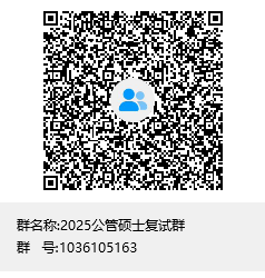 请考生扫码申请加入2025年公共管理学院硕士复试群(群号1036105163),验证信息为“本科学校-姓名”。入群后,将备注名改为“报考专业+姓名”。入群截止时间为2025319日上午12:00