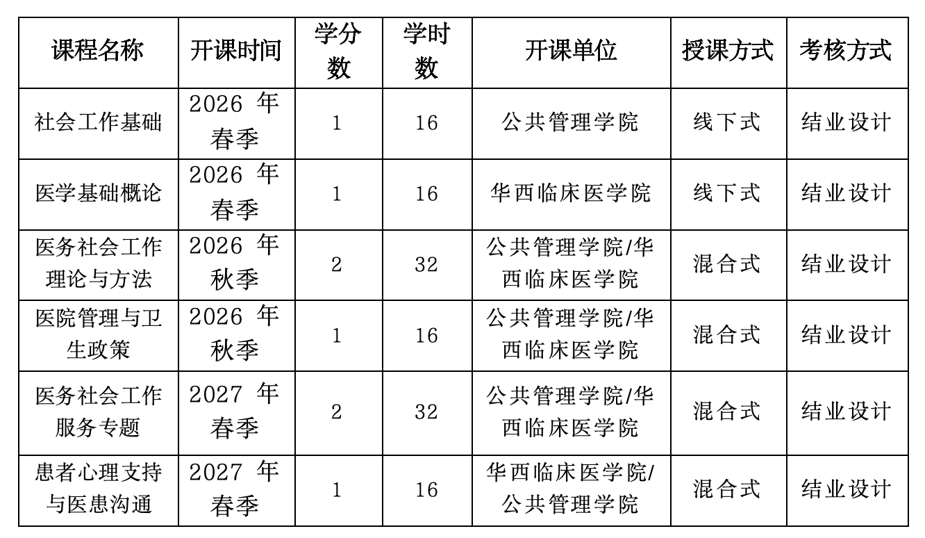 采用“课程学习+定向实训”培养模式,依托公共管理学院社会工作专业与华西医院多部门(科室)师资,提供6门“线上+线下”课程,计8个学分,涵盖社会工作基础、医学基础、医务社工专题三个板块内容。