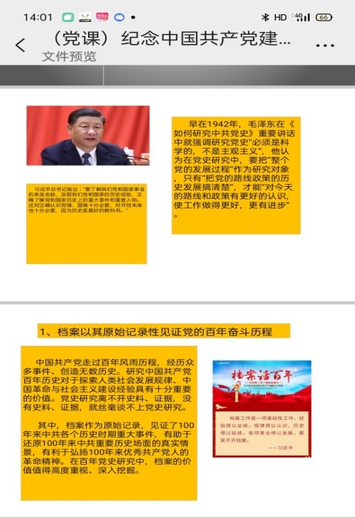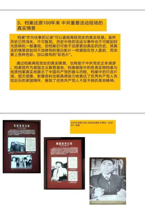 通过这次党课学习,尤其是从红色档案记录中更加直观体会到中国共产党人革命意志的坚定与伟大的家国情怀。“忆往昔峥嵘岁月,看今朝风华正茂。”薪火熊熊传百年,中国共产党所秉持的精神被一代代传承下来,并融入了新的时代精神。大家认识到,档案不仅记录了中国共产党百年奋斗史,也正在记录着中国共产党带领中国人民走向伟大的民族复兴,实现国泰民安、繁荣富强的中国梦的伟大事业。党课学习让同学们更加明确了要为中华崛起而读书,用真才实学报效祖国,牢记党的历史与宗旨,进一步弘扬党的百年精神,以更加积极的态度投入到今后的工作与学习中,进一步坚定了对档案学专业的热爱。