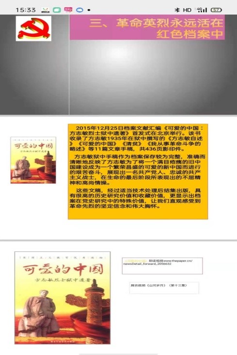接着大家一起观看了百集微记录:红色档案【恰同学少年】《毛泽东——伟大之器》、《李大钊——青春》《周恩来——觉悟的宣言》等红色档案纪录片。革命先辈的感人事迹再次让同学们感受到革命者意志坚强和不屈不屈不挠的伟大精神,更能感受到那一份热烈的爱国之情。最后,大家怀着崇敬的心情聆听了方志敏烈士遗著《可爱的中国》的配乐朗诵。