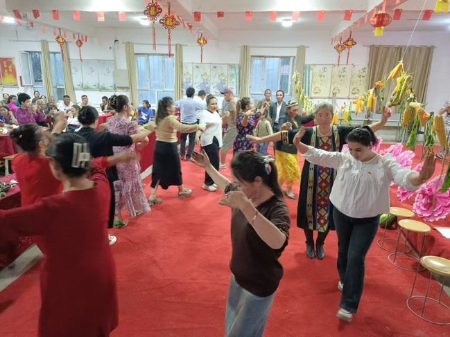 干部群众皆因丰收而倍感满足和幸福,庆祝活动提供了同吃共跳齐欢乐、载歌载舞庆丰收的展示舞台,吃着可口的月饼和自种的瓜果,群众自发跳起了欢快的麦西来甫,用音乐和舞蹈述说着丰收的喜悦,用实际行动践行着铸牢中华民族共同体意识和对盛世中国的礼赞。
