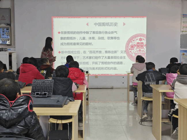 剪纸文化小课堂介绍了中国剪纸的起源、发展历史和中国剪纸的派系,带领小孩子们深刻感受剪纸艺术蕴含的深厚历史文化底蕴、悠久的传统文化和伟大的民族精神,领会剪纸艺术表达出的广大人民的社会认知、道德观念、实践经验、生活理想和审美情趣。“一把剪刀,一张红纸,纸随剪转,心随纸动”,通过剪纸作品的展示,分步骤演示,孩子们被一幅幅精美的作品深深打动,跟着老师的步骤由简到繁地临摹、裁剪。左一剪,右一剪,智慧在指间流转,趣味在指端跳跃。
