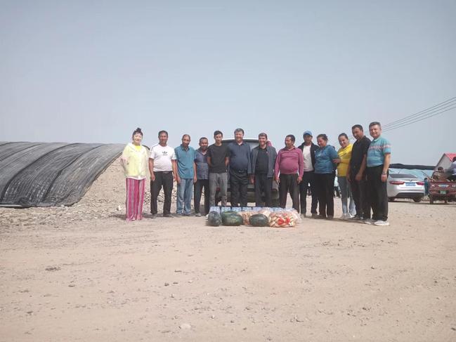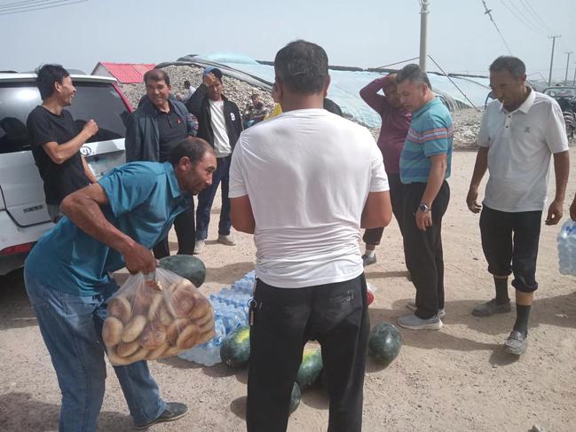 在得知戈壁产业园区远离村镇,农民中午用餐存在物资短缺的情况时,我校驻莎车县孜热甫夏提塔吉克民族乡喀勒提拉村工作队为农民送去了馕、西瓜、饮用水等物资,保障农民按时完成农业耕种任务。看着工作队送来的物资,村民图尔贡·图尔荪不由得竖起大拇指说:“这段时间,我们在大棚劳动,不能按时回家吃饭,工作队知道我们的难处后,及时给我们提供了这些吃的、喝的,让我们安心完成种植任务,工作队是真正地为我们办实事办好事!”
