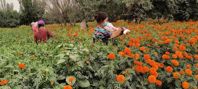 花开好时节,金色致富路。莎车县孜热甫夏提塔吉克民族乡喀勒提拉(9)村475亩万寿菊迎来收获时节,工作队带领村“两委”致力于将万寿菊的种植作为一项乡村振兴特色产业来抓,积极拓展产业链条,让村民通过自己的双手增收致富。简单的种植技术和田间管理,让村民也变身“种植能手”,村民在万寿菊的花海里穿梭忙碌着,将采摘下来的万寿菊装进干净的编织袋里,打包、搬运到货车里。如今,在工作队的科普和推动下,万寿菊已成为村民的“致富花”和“幸福花”,低成本、轻劳力、高产量的万寿菊种植成为“有颜有钱”的特色产业,勾勒出了农村特色产业发展新亮点,拓宽了村民增收渠道,也成为了村集体经济发展的新引擎。