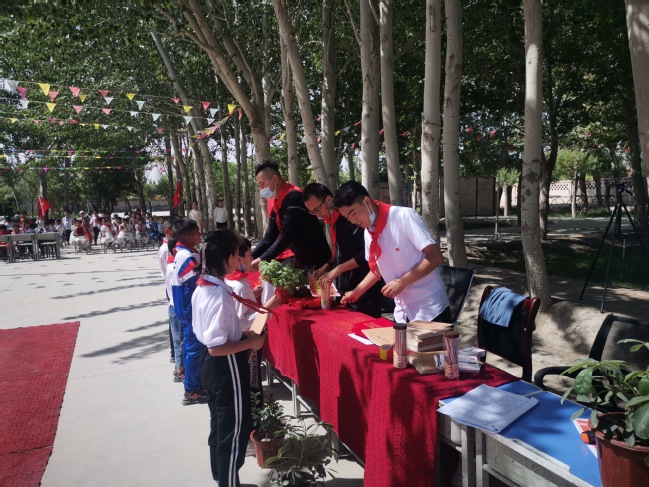 在鲜艳的五星红旗下,阿不拉·玉苏甫和艾克拉木·牙合甫对全体学生作了热情洋溢的讲话,并向孩子们致以节日的问候和祝福,他们希望孩子们能向获得奖品的同学看齐,树立远大理想,努力学好知识,养成良好习惯,实现自身梦想,以优异的成绩、健康的体魄、高尚的品德成为胸怀大爱,爱党、爱国、爱疆的有用人才。