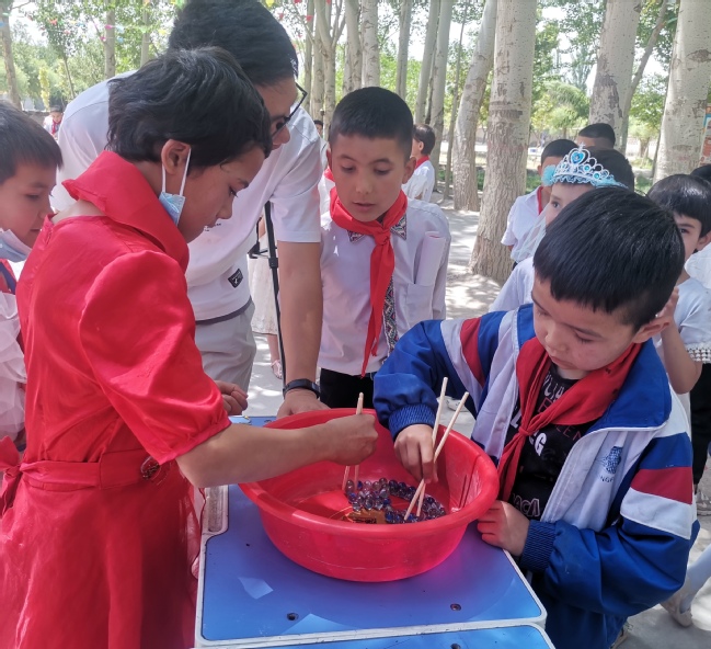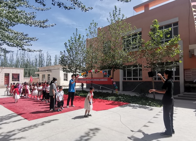 在英迈里村,6月1日上午,驻村工作队和村“两委”一行前往孜热甫夏提乡希望小学观看了“小小石榴籽,喜迎二十大”儿童节文艺汇演,并与学校4名实习学生组织了希望小学趣味运动会活动。趣味运动会设立了团体积分赛和个人比赛,包含跳绳比赛、“三人四足”、“螃蟹赛跑”、夹玻璃弹珠、踢球射门等五个项目,活动使孩子们在歌声、舞蹈和游戏比赛中度过了一个充实、多彩、快乐的节日。