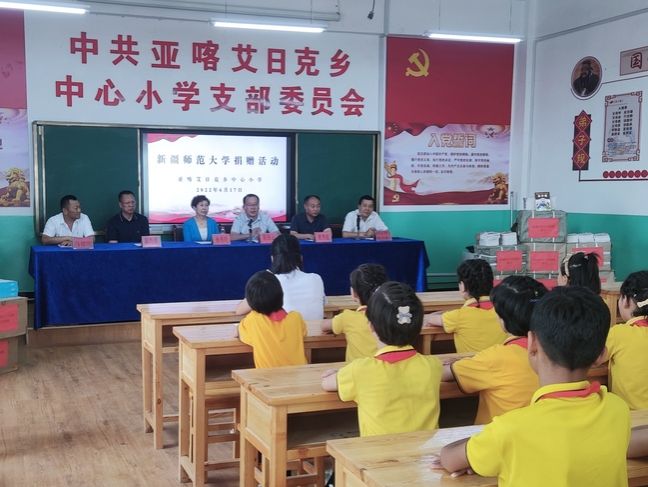 孙秀玲在讲话中说,自2021年3月起,学校开启助力亚喀艾日克乡教育教学工作,学校党委充分依托学校教育优势,在帮扶内容、帮扶机制上做好顶层设计,把对亚乡小学的帮扶作为“访惠聚”工作的重要任务,通过派驻经验丰富的管理干部、骨干教师和实习支教学生,充实优化教师队伍,提升办学水平;通过开展“双师课堂”,创新教学模式,安装专网并购置平板电脑,做好教学保障工作;开展假期“小课堂”、组织夏令营活动等,提高亚乡小学教育教学质量;制定《中华优秀传统文化进校园实施方案》,深入推进文化润疆工作落实落小,铸牢中华民族共同体意识,已初步形成“日常教学+周末小课堂+假期小课堂+夏令营”的教育帮扶模式。为改变亚乡小学办学条件和学习条件,学校用全体党员捐款形成的“初心基金”连续两年向亚乡小学捐赠包括图书、教学设备等,充分体现了新疆师大党委和全体教职工们对亚乡孩子们的关心关爱,也是师大人教育情怀和社会责任的具体体现。