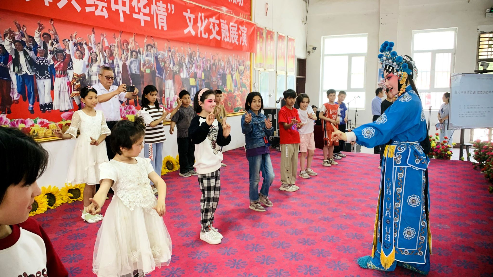 活动期间,新疆秦剧团(乌鲁木齐市秦剧团)演员走进团结村小课堂,开展“粉墨团结,戏润童心——乡村小课堂戏曲体验日”活动,演员们给学生绘脸谱、穿服饰、戴道具、教身位,让学生们学习戏剧、体验戏剧,近距离感受中国传统文化。