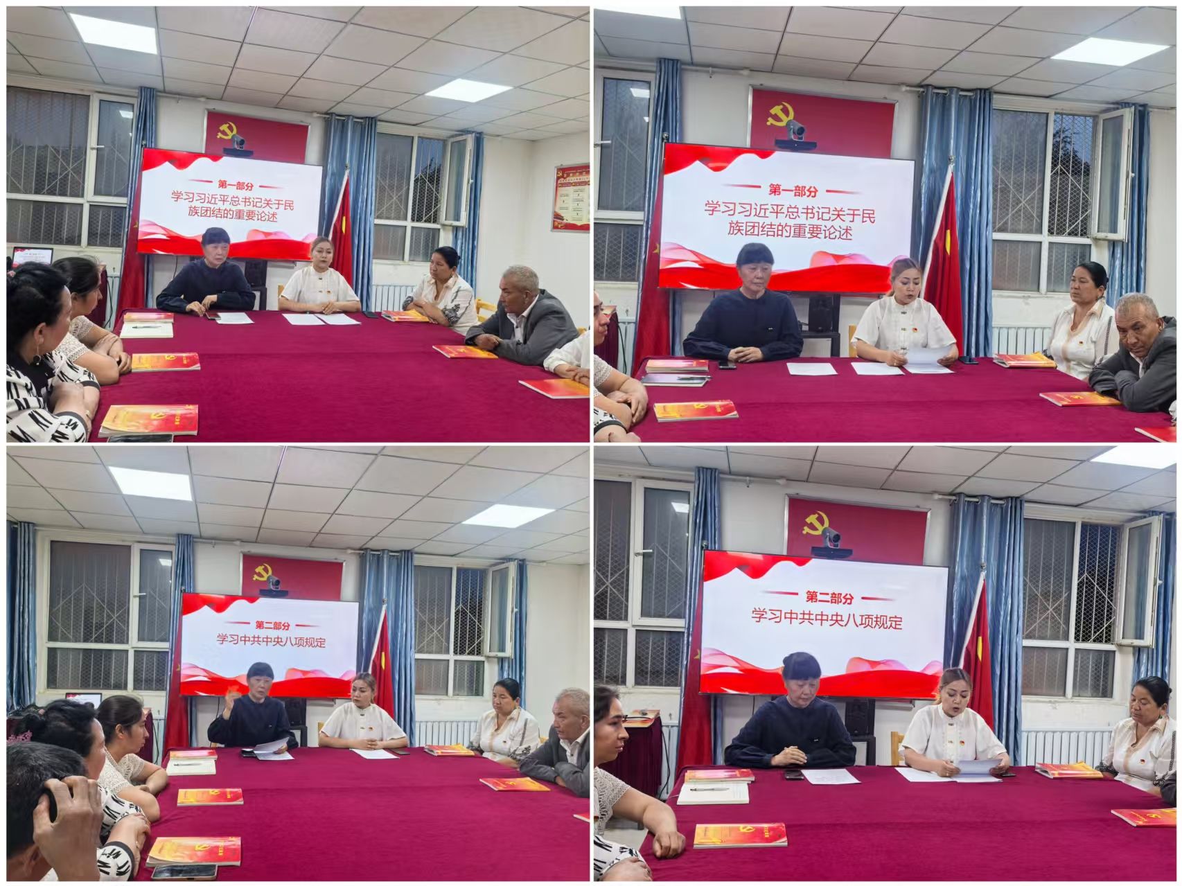 亚喀艾日克乡亚喀艾日克(8)村工作队党支部联合村党支部带领党员学习习近平总书记关于民族团结的重要论述和中央八项规定精神,组织党员重温入党誓词、观看民族团结典型案例视频、分享身边的民族团结故事。