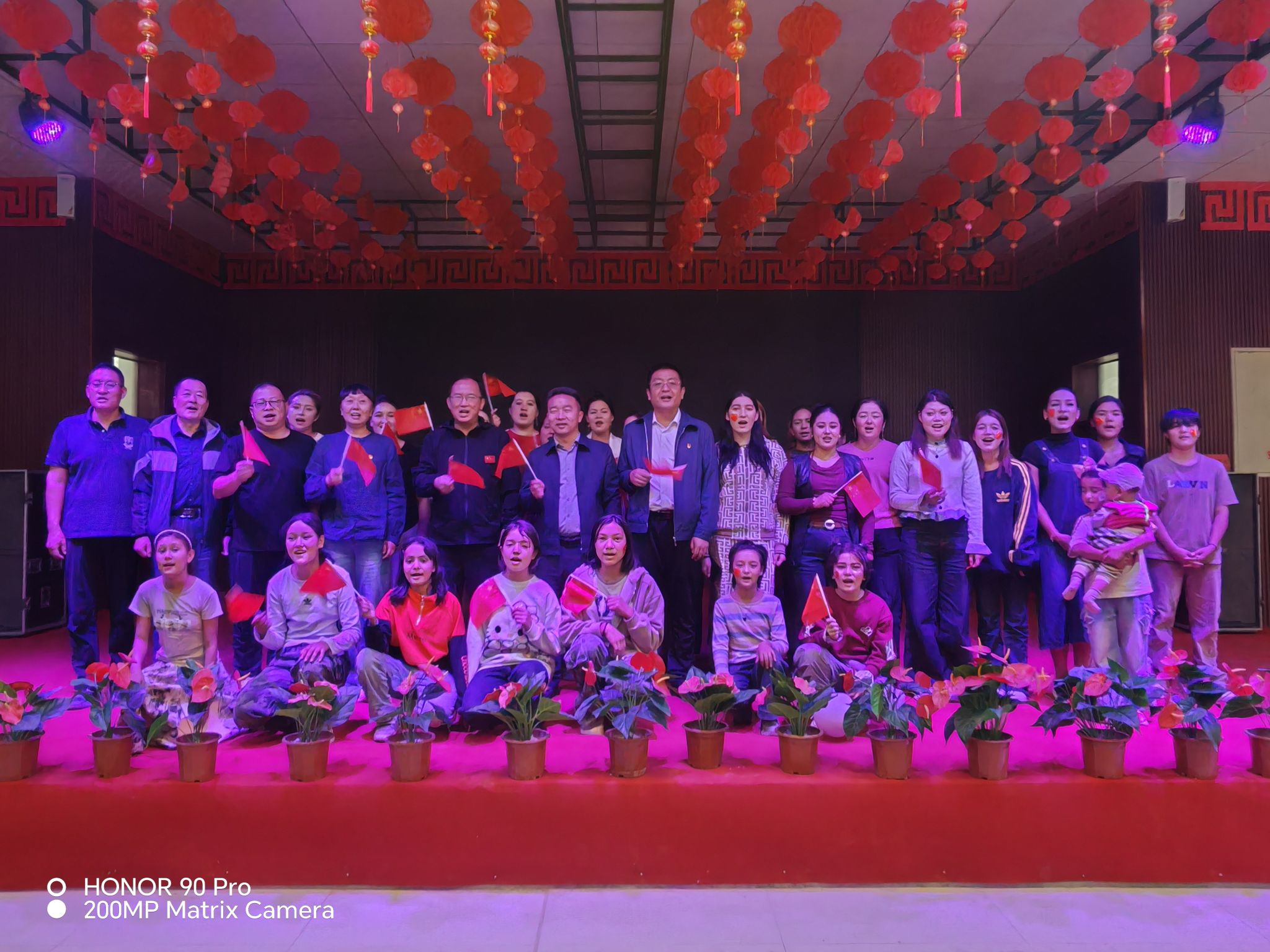 与村民一起挥舞国旗同唱《没有共产党就没有新中国》